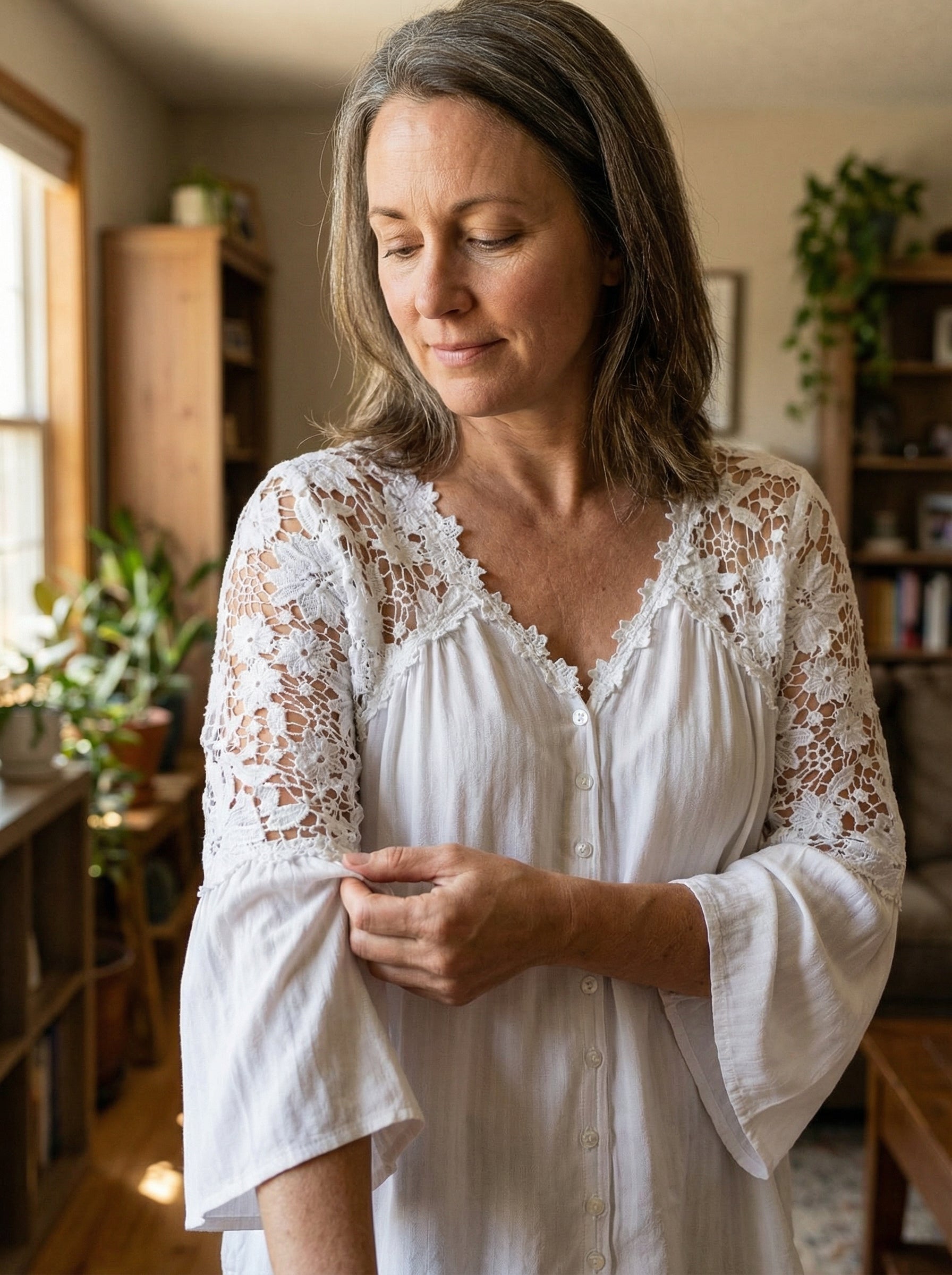 La Blusa Clara es perfecta si buscas un toque femenino sin renunciar a la comodidad. Los detalles de encaje en hombros y espalda aportan un acabado delicado y sofisticado, ideal para elevar un look sencillo sin recargarlo.